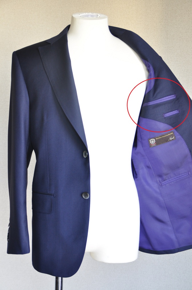 「お台場仕立て」の名前の由来は、その形がお台場(砲台)に似ているからです。昔はジャケットの裏地が擦り切れると裏地を張り替えて着ていたため、張り替えの時にポケットまで作り直さなくていいようにということから「お台場仕立て」が生まれ、高級紳士服の代名詞とされていました。現在では化学繊維等の裏地が増え、裏地が擦り切れて張り替えをするという方はほとんどいらっしゃいませんが、内ポケットに物を入れても形が崩れにくいことや、見た目の高級感に注目が集まっています。