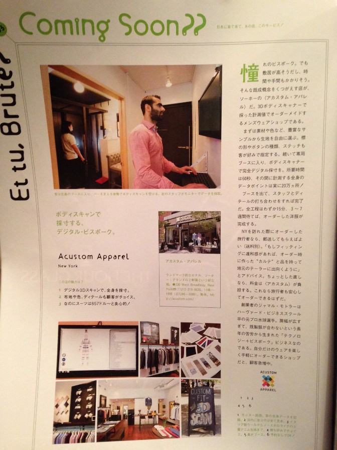 ニューヨークのアカスタム・アパレルというショップでは3Dスキャナーを用い完全デジタル採寸を行っています。