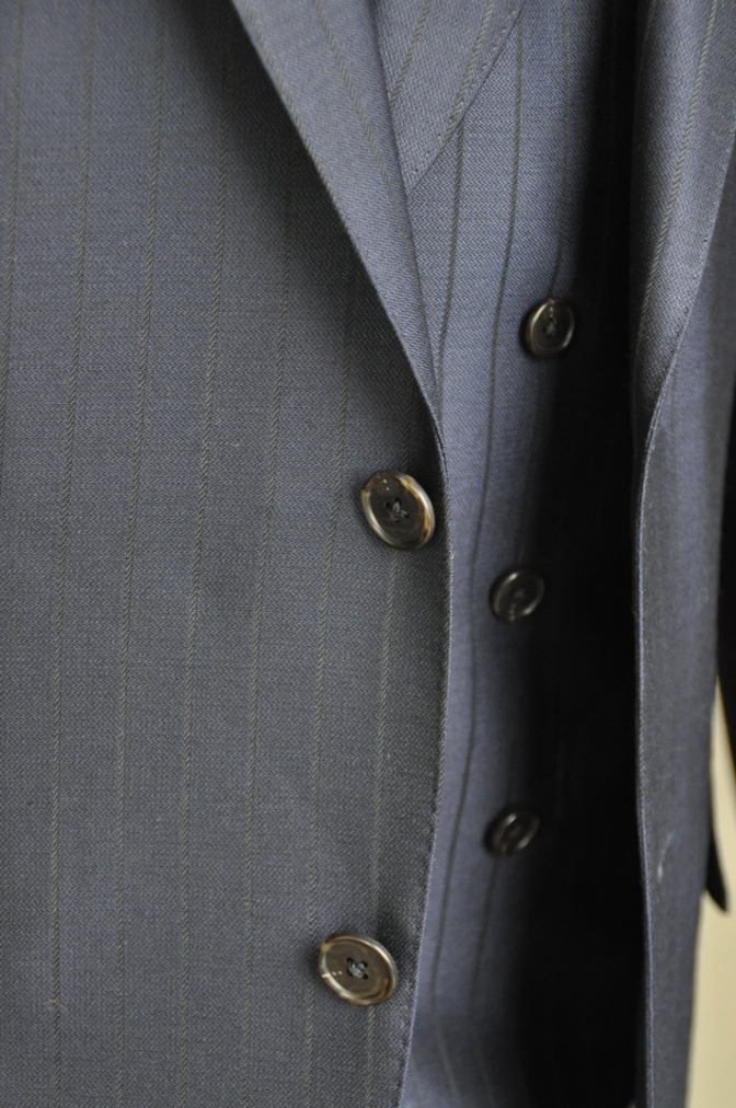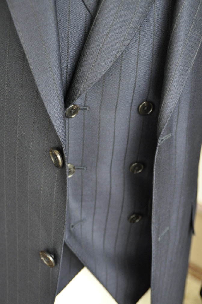 シングル2つボタン、衿付ダブルのジレ、スリーピースにてご注文いただきました。
