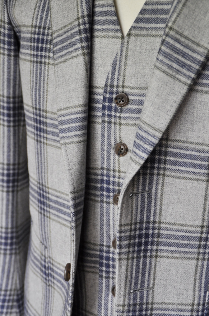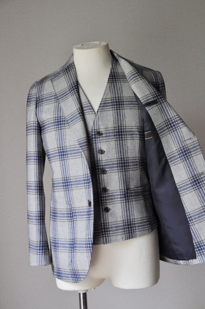 シングル2つボタンのスリーピースにてご注文いただきました。