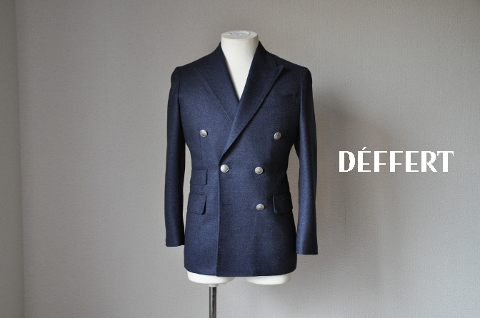 お客様のジャケットの紹介-無地ネイビーフランネル ダブルジャケット-お客様のジャケットの紹介-無地ネイビーフランネル ダブルジャケット-お客様のジャケットが出来上がってまいりましたのでご紹介いたします。生地は無地ネイビーフランネルダブル6*2のジャケットにてご注文いただきました。Cloth:無地ネイビーフランネル裏地:グレーペイズリージャケット形状:ダブル6*2ラペル:ピークドラペル胸ポケット:バルカポケット腰ポケット:チェンジポケットベント:サイドベンツ袖ボタン: 4つT様ご注文ありがとうございました。DEFFERT/デフェールWeb Site:http://www.deffert.net