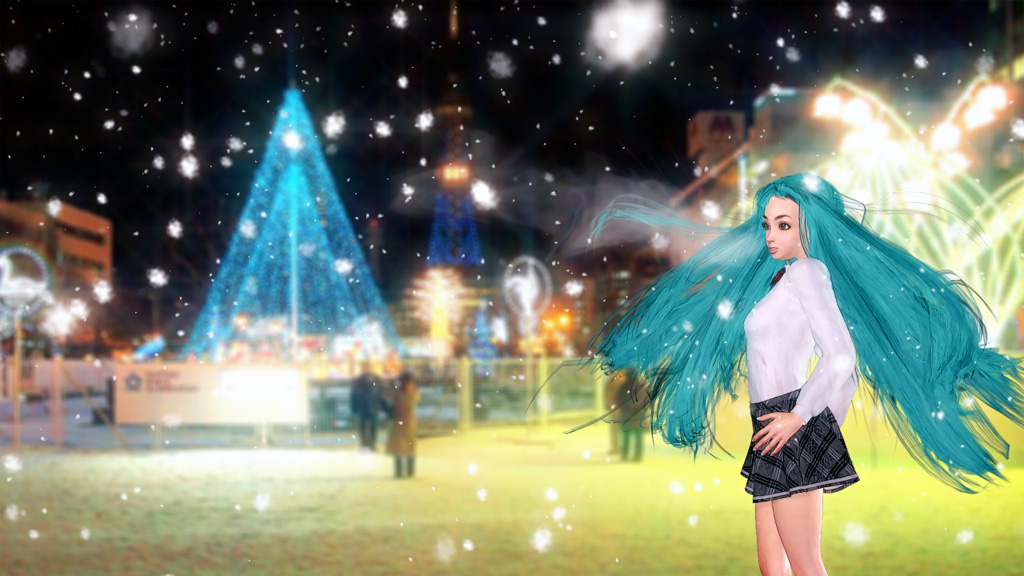 より幻想的になるようにライティングなどで編集していますが、実際の札幌は、このミクさんのようなカッコで居ると10分持たないかもです…(((( ;°Д°))))