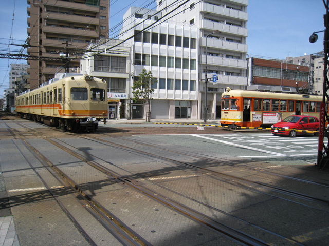 オタクさんです(笑)正解は・・・正解は、ダイヤモンドクロス.。゚+.(・∀・)゚+.゚伊予鉄の大手町駅前の交差点。路面電車と郊外電車・伊予鉄高浜線が交差するダイヤモンドクロスです^^