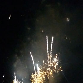 横から見た花火と、越後ビール新潟キャラクター
