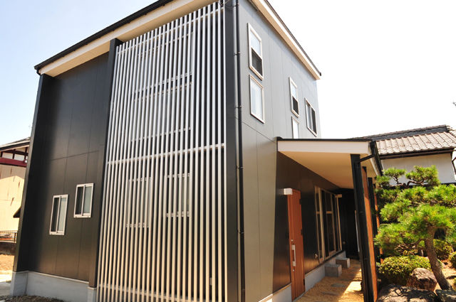 古い離れの前の既存の庭を残しアプローチとして使用。 長さ1.5mの大きな庇にはオープン空間と格子でデザイン。 庇から下屋部をつなぎ片流れの大きな屋根が和風の雰囲気。