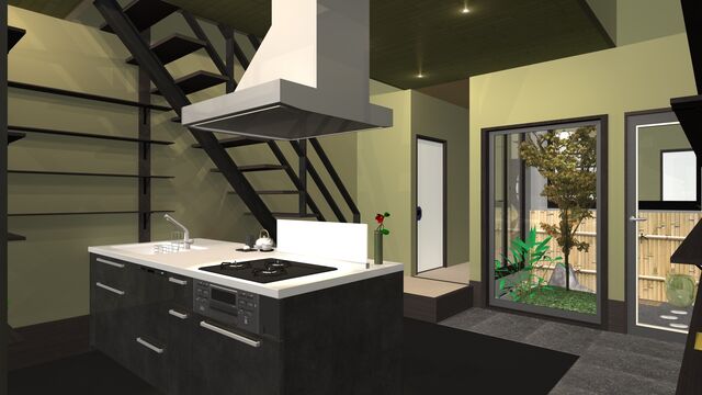 カウンターキッチンや坪庭の茶室へと奥行きを感じさせる設計で、境界がなく空間が結合します。