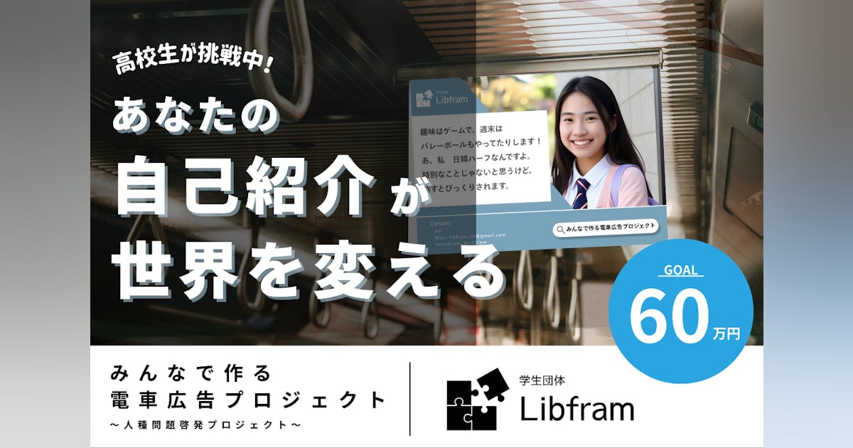 全国の高校生が中心となって「すべての人が自分のルーツに誇りを持てる社会を」をモットーに活動する学生団体Libframは現在、「人種や多様性に関する啓発の機会をより多くの人に届けたい」という思いから、クラウドファンディングを立ち上げてます!