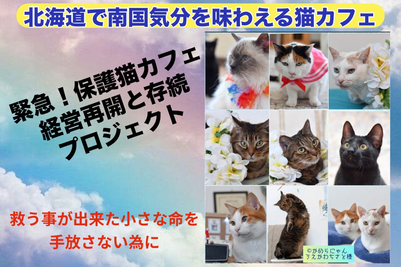 再チャレンジ!猫カフェの為のクラウドファンディング【虹の橋に願いを】廃業危機の“南国×猫カフェ”10匹の保護猫たちに生きる場所を!北海道で南国気分を味わえる猫カフェ。小樽市初の猫カフェの、老朽化した設備の衛生費と、10名の保護猫の居場所確保・飼育に係わる費用・猫カフェ再開と存続の支援を!camp-fire.jp猫カフェ存続の危機&10名ニャンズを守る場所の維持支援を!1人でも多くの方に届きますように☆。.:*・゜🙏