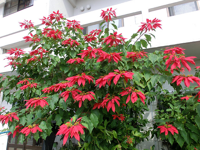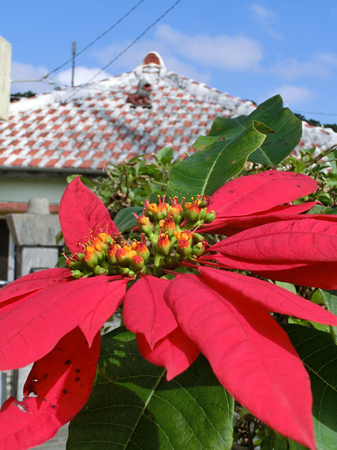 ポインセチアポインセチア 別名:ショウジョウボク(猩々木) この前晴れた時の写真です。 ここ数日沖縄は曇りや 細かい雨が続いてます。 沖縄だと涼しくなったころから 目に付くようになるかな また庭など地植えしてると 人の高さを軽く超えます。 1枚目と違う場所のポインセチア 後ろの赤瓦とポインセチアが良い感じの お気に入りの場所で この花が咲いてると撮影できるの楽しみにしてます。 トウダイグサ科/ユーフォルビア属