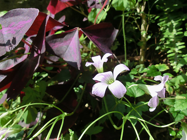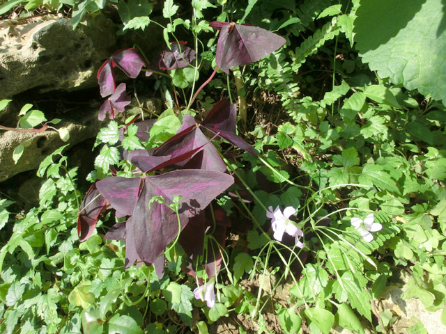 トリアングラリス(紫の舞)トリアングラリス(紫の舞) ここ数日沖縄も寒さが戻り かなり冷え込んでます。 こちらも鉢植えから飛び出して プチジャングルに生えていた紫の舞です。 濃い赤紫色の葉が綺麗 写真だと分かりにくいけど 薄いピンク色の花です。 カタバミ科/カタバミ(オキザリス)属