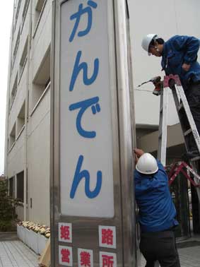 養生シートをはずしながらステンレスの枠を元通りにはめ込んでいく。そう、お気づきの通り看板は「かんでん」から「関西電力」にリニューアルされた。