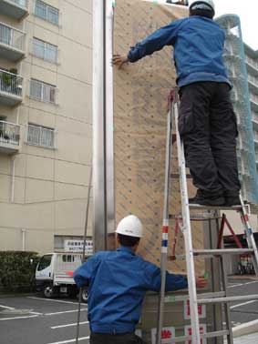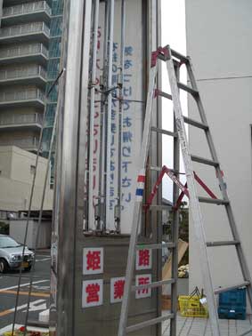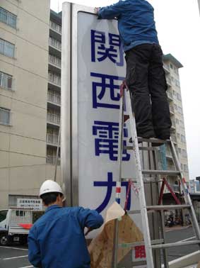 今日は、弊社が日ごろどんな仕事をしているかちょっとだけ公開します。写真は関西電力姫路営業所様のメイン看板の板面の交換作業をやるところです。