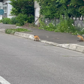 楽しくくつろいでいるキツネの親子を見ました