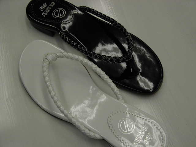 コチラは ぺったんこのトングサンダル。アジアン風なアイテムも ノーネームが作るとこうなります。流行のエナメルといい・・・流れるような形といい・・・~ン~パリのに・お・い