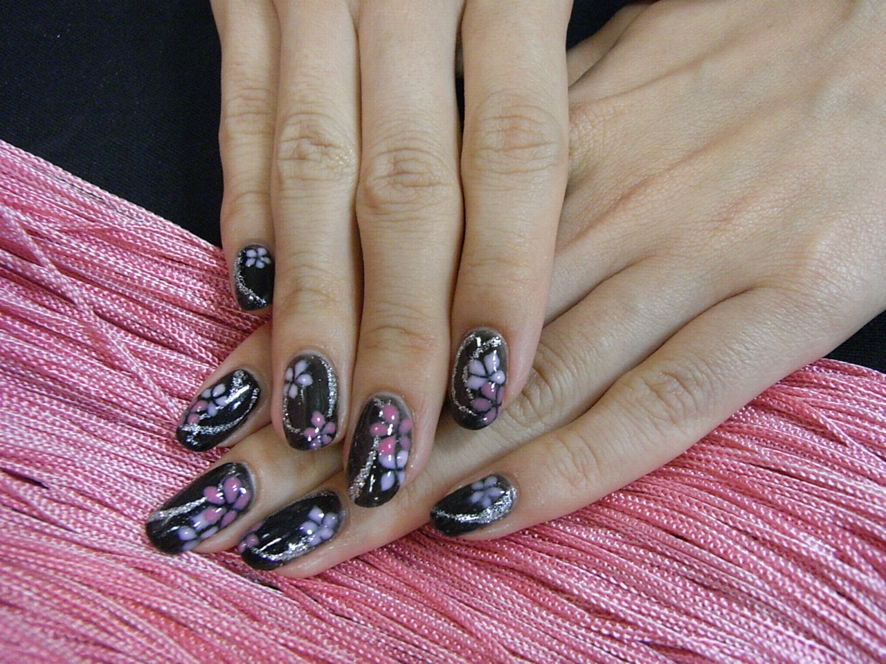 黒の浴衣だったので、ベースは黒で、濃いピンク&薄いピンクのジェルでお花を描いてもらいました