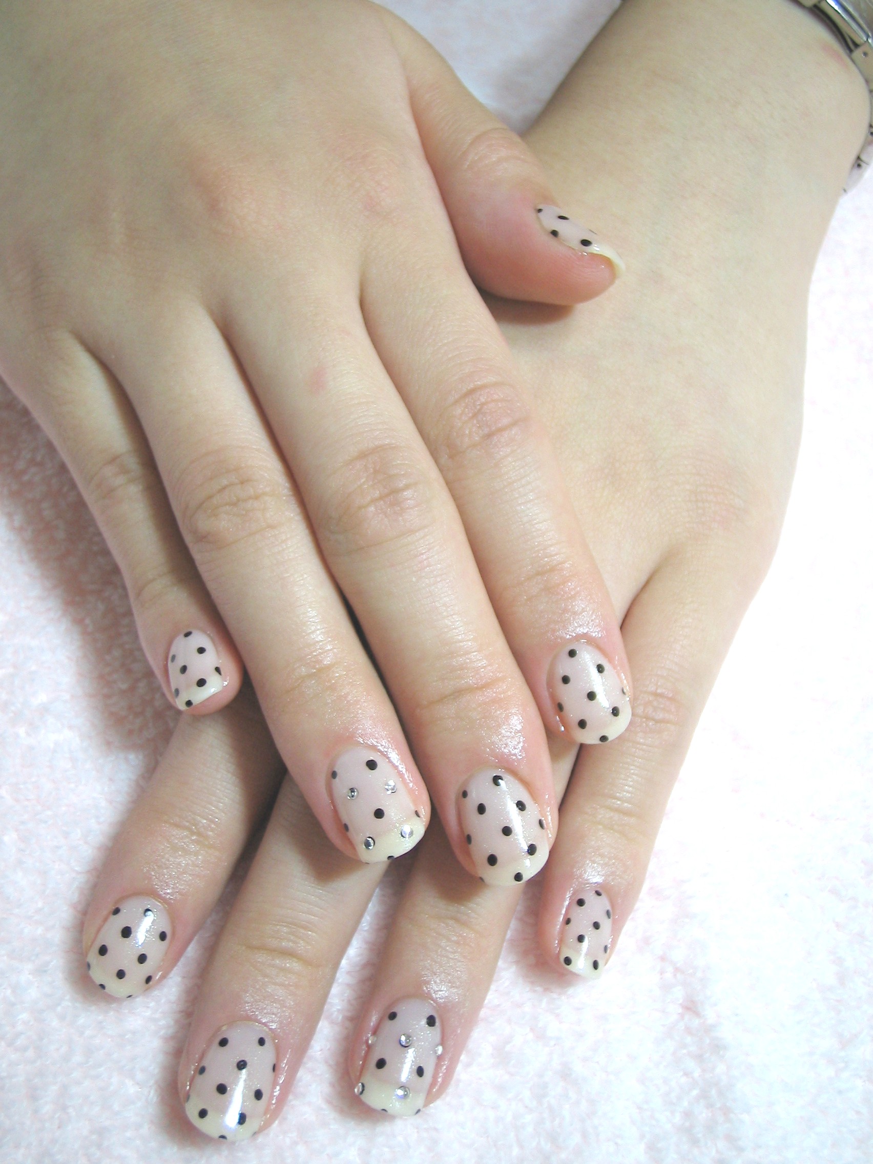 ドット~水玉~カルジェル台風接近!!ですっごい雨の中来てくれました。ネイルしながら雨がやんでいったので「よかったですね~」とか言っちゃって終盤に連れてどんどん雨が強くなっていった時はベラベラ喋ってた自分が気まずくて目が見れませんでした。。。(-_-;)家が結構遠いので帰りはちゃんとかえれたのかなぁ。。。今回はお客様のご希望でベビーピンクのベースに黒のドットです☆薬指にのみ所々クリスタルのスワロフスキーを使いました(*^_^*)このアート気に入ってくれたらポチッと↓↓