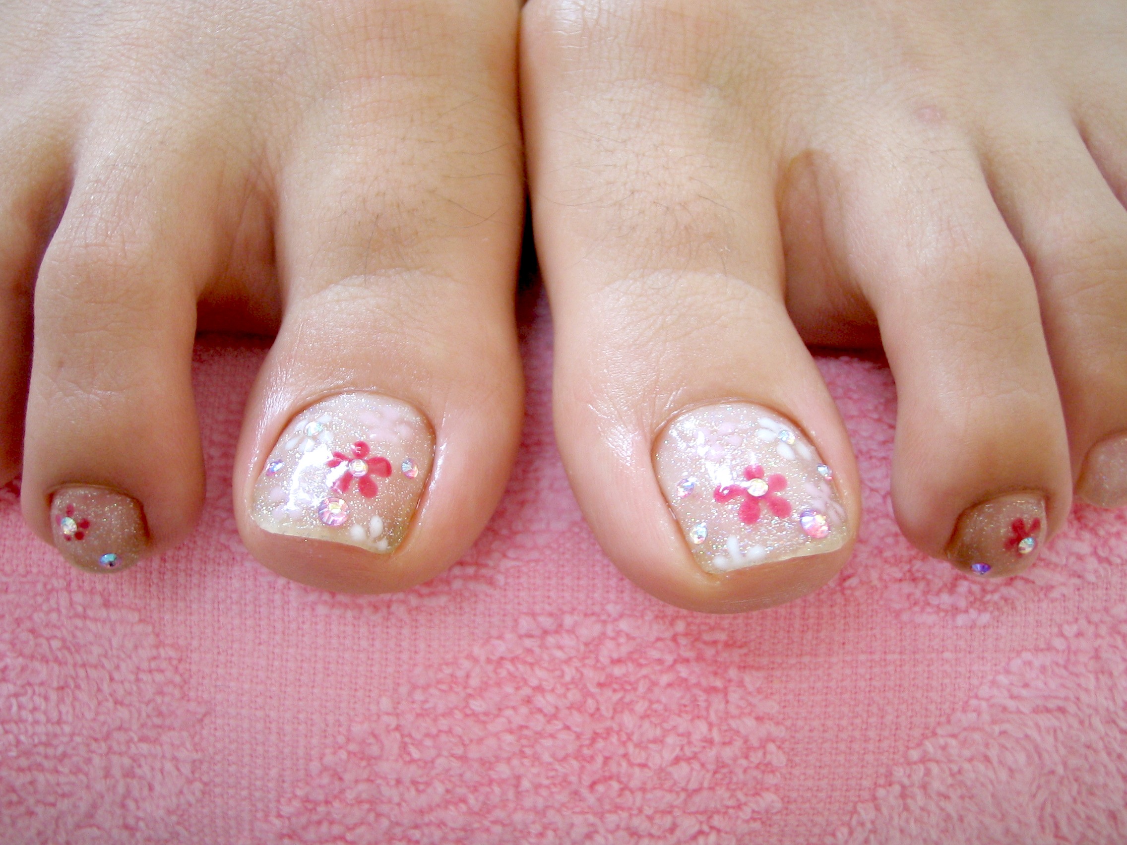 カルジェルのラメ入りクリアをベースにカルジェルのカラー(赤、ピンク、白)で5枚花を作りました。