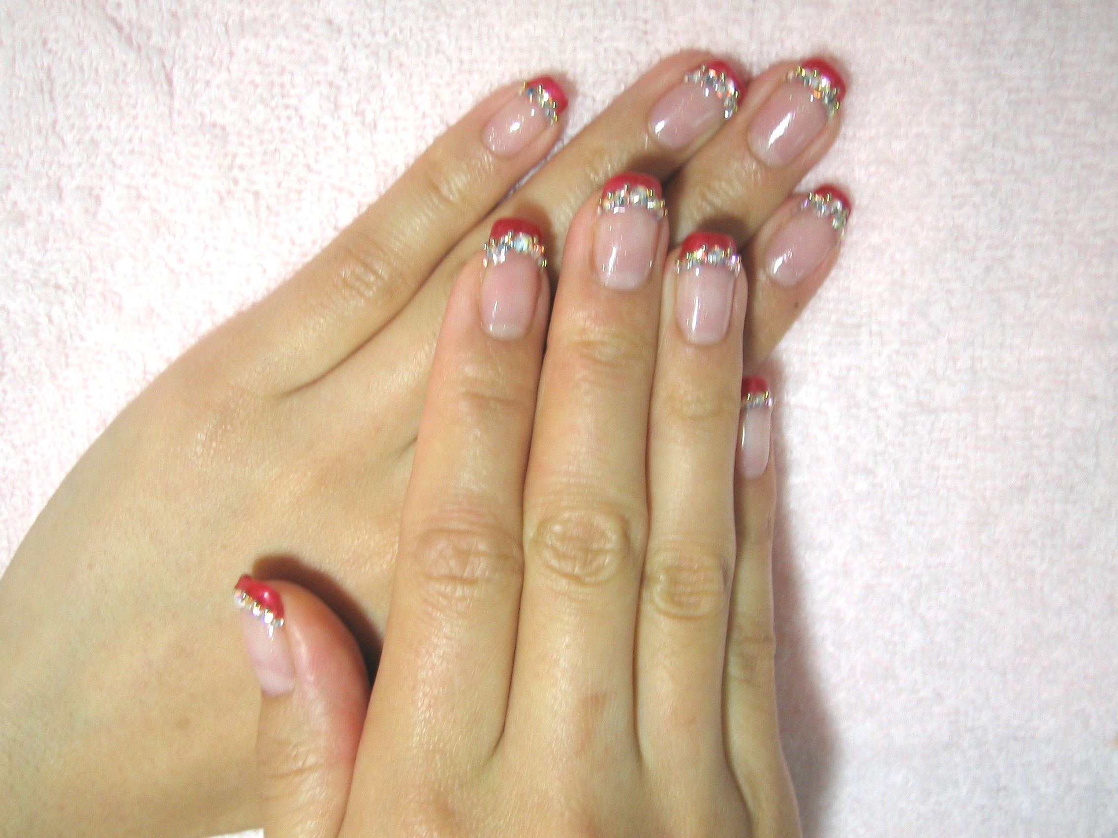 ネイリストの成ちゃんにやってもらいましたー\(^o^*)/赤フレンチでもベースをクリアにすると洋服に合わせやすくなりますよ♬