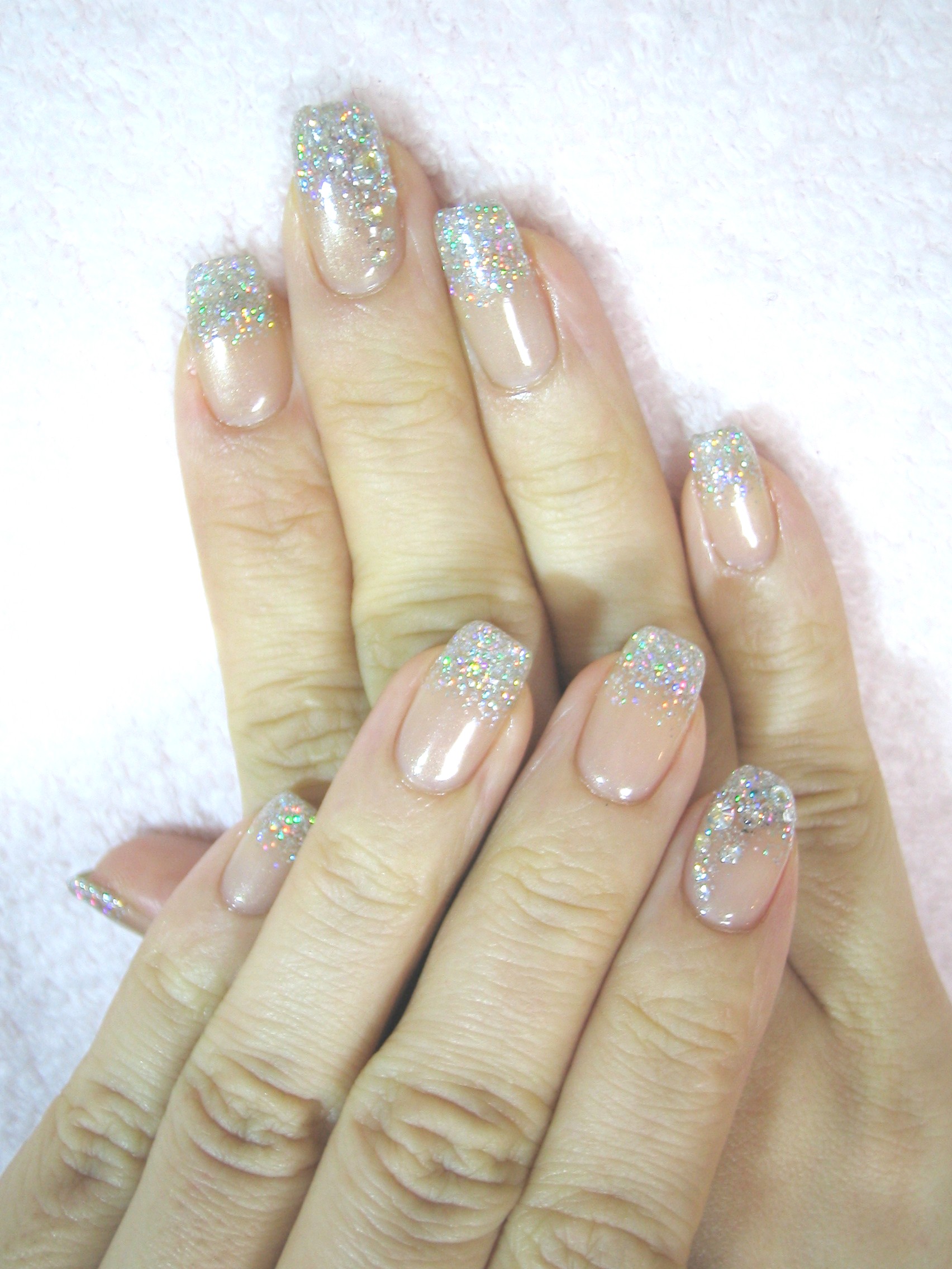 結構キラキラOKが出たので先端グリッターでグラデーションです。キラキラいっぱいにしてもアートとグリッターの色見を統一させればにぎやかな印象は避けられます。