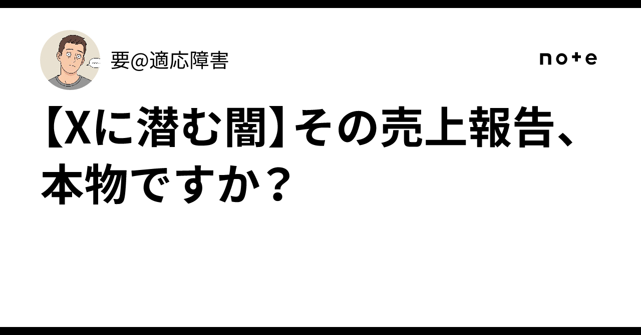 【Xに潜む闇】その売上報告、本物ですか?|要@適応障害あなたのX(旧Twitter)のタイムラインにも、いませんか? 「今月、noteで〇〇万円達成しました!」 「開始3ヶ月で売上7桁突破!」 キラキラした成功報告と、それを証明するかのような売上画面のスクリーンショット。すごいな、自分も頑張ればこうなれるかも…! そう思ったあなたは、要注意です。 その輝いて見える報告の裏には、深く、そして気付きにくい「…note.com