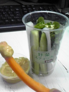ベジタボー!!普段野菜の摂取を怠りがちになりますが今日はバイト中に野菜スティックなる物を差し入れで頂きました☆生野菜を味噌をつけてバリボリ…ひたすらバリボリ…まだまだバリボリ…たまにお茶飲んでそれからまたバリボリ…う~ん最近の野菜スティックはジューシーだな(笑)美味しく頂きました。普段、肉ばっかじゃそりゃ栄養偏るわっ!!やっぱりたまには野菜食べなきゃいかんね(^-^;