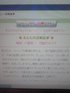 年甲斐にもなく恋愛占いドルは占いは信じない(≧ヘ≦)とてつもない書き出しですが( ̄▽ ̄;)先日奨められてパソコンから恋愛占いをやってみました(笑)結果はアップした写真のように出ました…(ちょっと見辛いですが)正直当たってるだけに信じたくないなぁ~と思うドルでした(^-^;(苦笑)