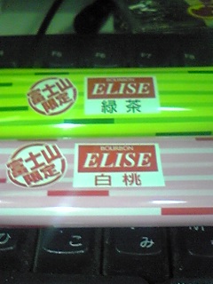 限定品に弱いですふらっと入ったコンビニとかでたまたまお菓子の棚で[期間限定]とか[限定品]とか書いてあると思わず買ってしまうドルです…(^-^;今回は同じ商店街のキャバクラのお兄さんが富士急ハイランドに行ってきたらしくお菓子の[エリーゼ]富士限定品をお土産で頂きましたぁ~(^-^)/白桃味と抹茶味でしたが美味しかったデス♪ご馳走様でしたm(_ _)m