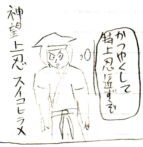 この物語の主人公。「スイコヒラメ」。最初から割合位が上なのは、完全にパワポケの影響。下忍を雇って、敵に立ち向かうという戦略的なゲームでした。
