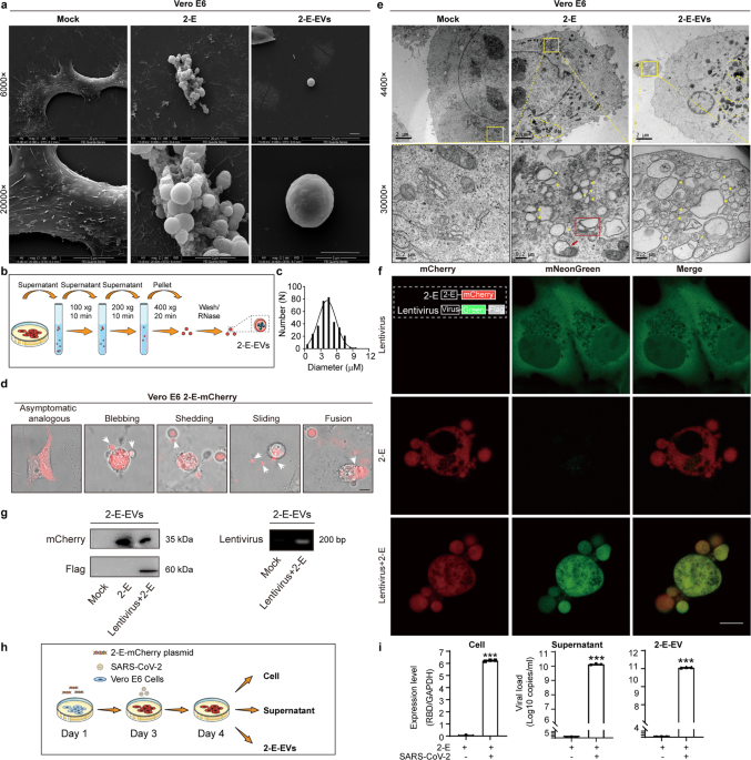 興味深いことに、2-E を発現した Vero E6 細胞からは、生物学的機能が不明な EV が多数分泌されて いることが走査型電子顕微鏡(SEM)により観察された(図 1a)。SEMでは、2-Eを発現した細胞体が丸くなり、スライド培養から細胞が部分的に剥離することが確認された。また、多くのEVが宿主細胞から突出して表面に付着しており、ブドウの房のような外観をしていた。排出されたEVは丸く、滑らかで、母細胞よりも小さかった(図1a)。1つの脱血細胞は1〜15個のEVを生成することができた(平均3個)。ミトコンドリアや小胞体(ER)などの細胞小器官の分離パラメータを参考に、2-E誘導型EV(2E-EV)は、複数回の最適化の後、差動遠心分離を用いて分離した36,37。2-E-EVs のサイズは、無作為に選んだ 100 個の EV の断面直径を顕微鏡で測定して確認した。72% の小胞は直径 3 ~ 6 μm、平均直径 4.3 μm であった(図 1b、c;補足図 S4)。