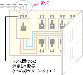 - 主ブレーカーのアンペア(A)数は多いものが良い。また、単3/3線がつながっていることを確認すれば200Vに切り替えが行える。