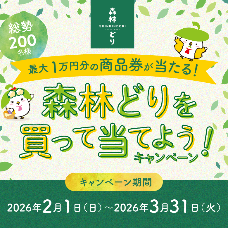 森林どりを買って当てよう!キャンペーン実施中!期間中、森林どりを含む2,000円(税込)以上お買い上げで豪華景品をプレゼント!