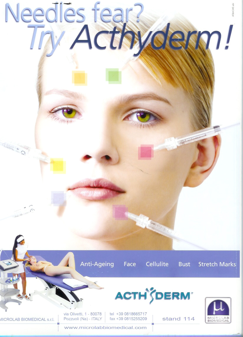 3月のパリでのアンチエイジング・ワールド・コングレス2006の学会会場において、アクシダーム(Acthyderm)というイタリアのアンチエイジング用医療機器が展示されていました。基本的には美容皮膚科的なマシーン(メディカル・コスメティック・ディバイス)であったので、さらっと見た程度だったのですが、こちらに戻って来て、知り合いの美容外科のドクターもこれを勧めるので、今日は恵比寿AACでデモをしてもらうことに。