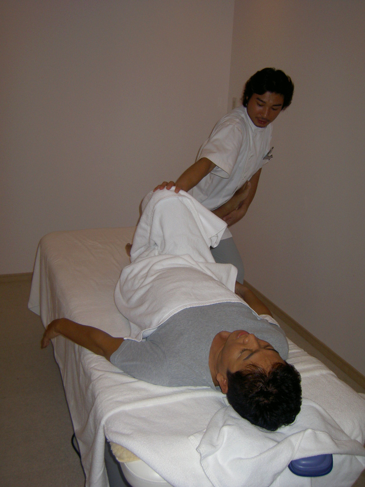 次に下腿。それも左の前脛骨部。右に比べ確かに圧されると圧痛を感じるところがあり、コリコリしている。森谷先生に指摘されるまで全く気が付かなかったのだが、明らかに右下腿の筋肉が疲労しているとのこと。そこでよ~く思い返してみると、以前スキーで右膝関節の靭帯を痛めていたことと、1ヶ月くらい前にジョギング中に左足首を軽く捻挫していたことを思い出したのだ。