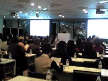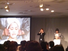 第1部は塩谷先生による、美容医学の概説。症例写真を多く提示して、一般の方向けにとてもわかりやすく、お話くださいました。第2部は、田中先生の実演“造顔マッサージ”。私の隣にはマエノリこと前田典子さんが座っていらっしゃいましたが、本気でマッサージしてました(初めてお会いしましたが、やる必要ないんじゃないかと思えるほど、キレイで小さなお顔でした)。第3部は参加者の方からの質問にお二人が答えるというコーナーもあり、とても充実した内容でした。もちろん、会場は超満員で熱気ムンムン