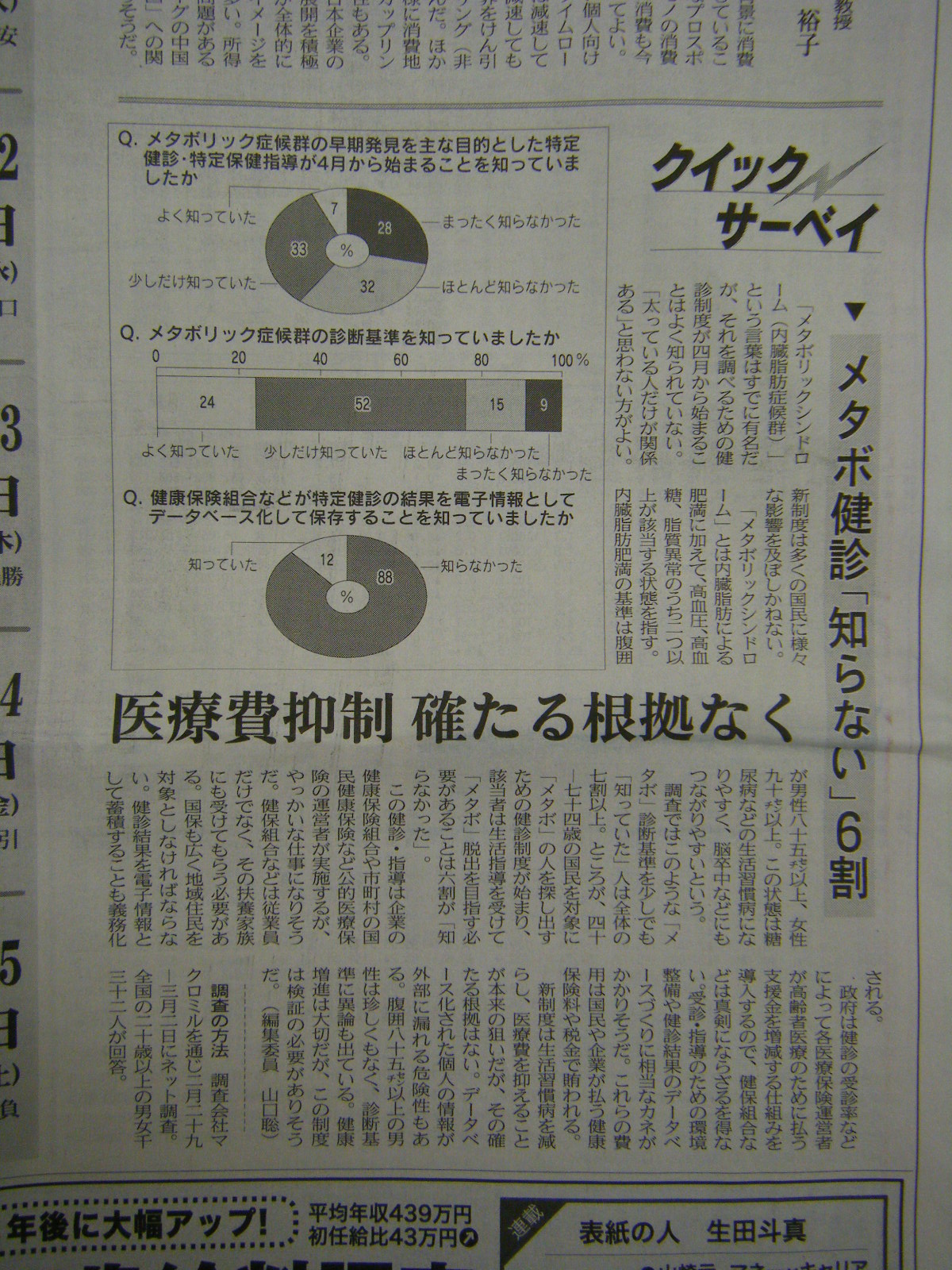 今日の日経新聞のクイックサーベイというコーナーに『メタボ健診「知らない」6割』なる見出しが。