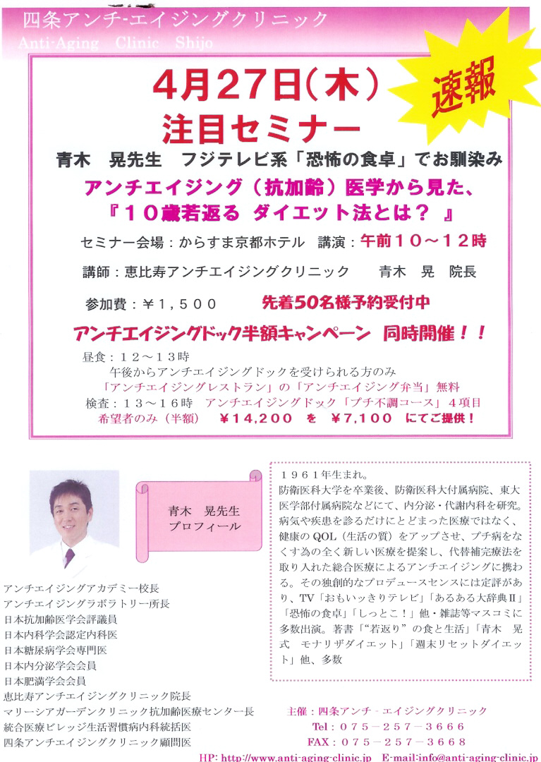 来週4月27日(木)に京都でアンチエイジングダイエットをテーマにした私のセミナーがあります。四条アンチエイジングクリニック主催のこのセミナーはこれまでは、同クリニックで行っていたのですが、毎回大変好評で今回は場所を「からすま京都ホテル」に移してかなり大々的に行うことになりました。