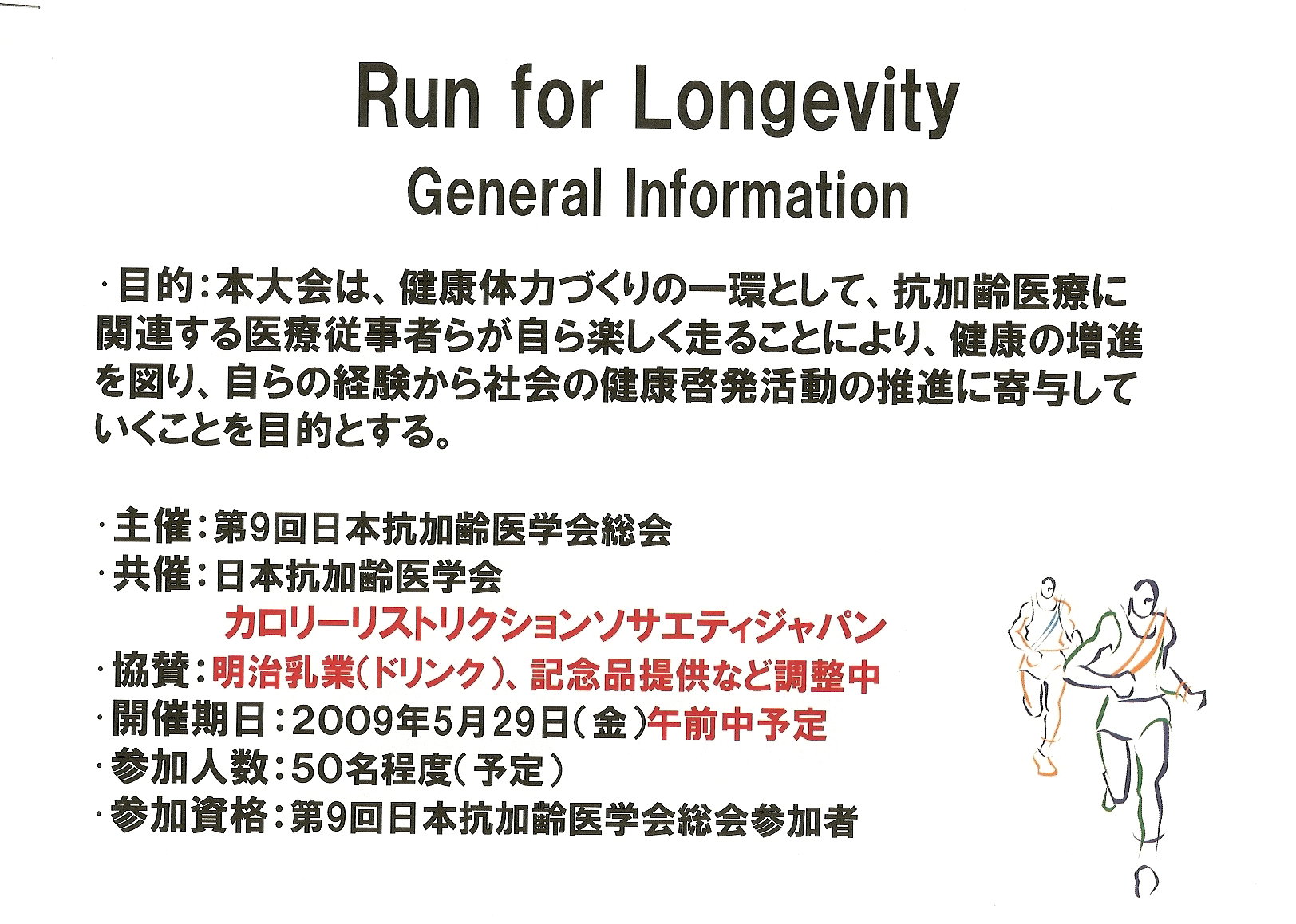 今度の日本抗加齢医学会総会は5月28日(木)~29日(金)に東京お台場はホテル日航東京で開催されます。その中で3年前から行われているマラソン大会『RUN FOR LONGEVITY』が今回も企画されています。一応、私が大会実行委員長を仰せつかっています。
