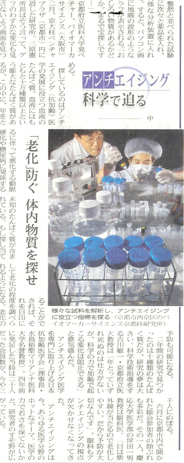 一昨日から日経の夕刊の第一面に『アンチエイジング 科学で迫る』というタイトルで3回連続の特集が掲載されている。一回目は東京都老人総合研究所の白澤先生プロデュースのアンチエイジングレストランユリス麻布十番のことが紹介されていた。昨日は日本抗加齢医学会副理事長の吉川敏一教授が中心になって進められている抗加齢医学におけるエイジングに関係するバイオマーカーの研究のことが取り上げられていた。