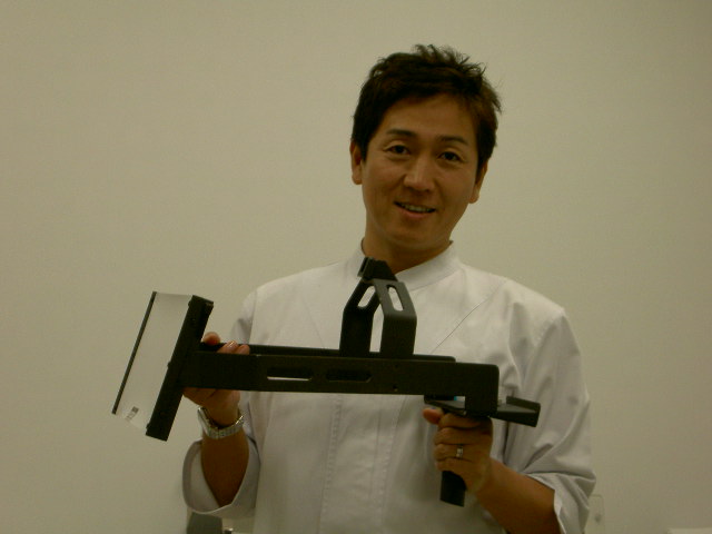 写真は恵比寿アンチエイジングクリニックの「QOLドック」検査室で、セルライトをチェックする機器を持った“ごきげん”な私です。