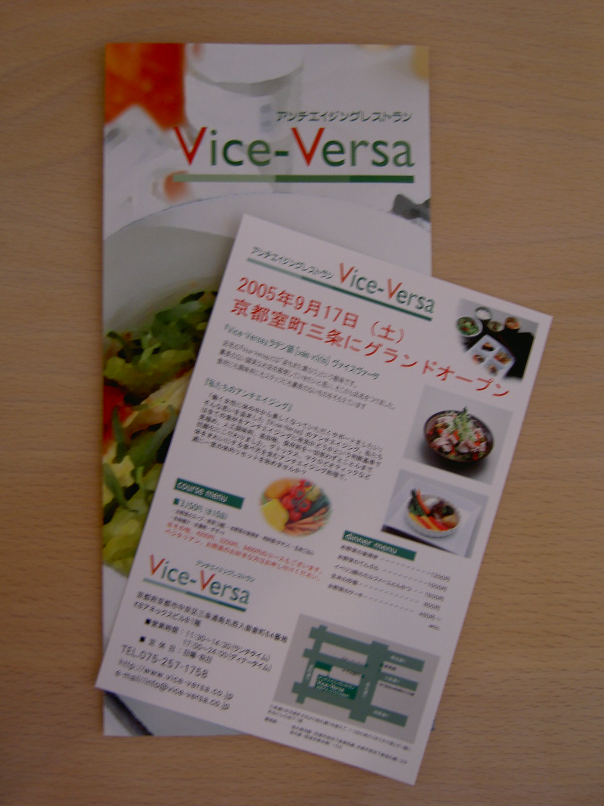 今日は京都の四条アンチエイジングクリニックに来ているのだが、天野院長先生から京都にもアンチエイジングレストランが出来たと聞いた。名前はVice-Versa(ヴァイスヴァーサ)というらしい。四条アンチエイジングクリニックにもレストランのオーナーの方が挨拶に来られたとのこと。