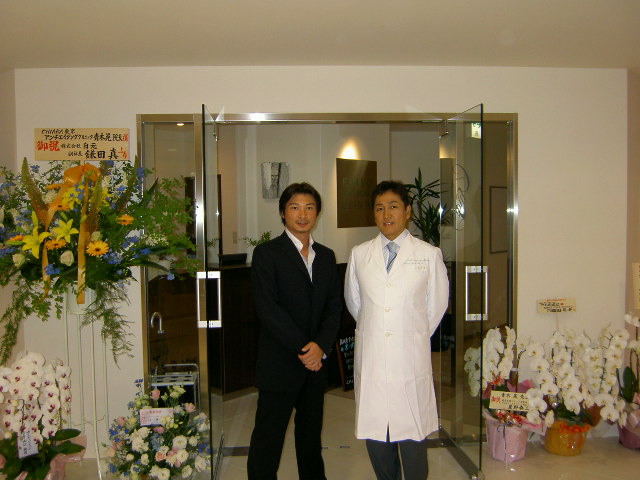 写真は新しいクリニックの前で、カリスマ・カイロプラクターの森谷先生と。