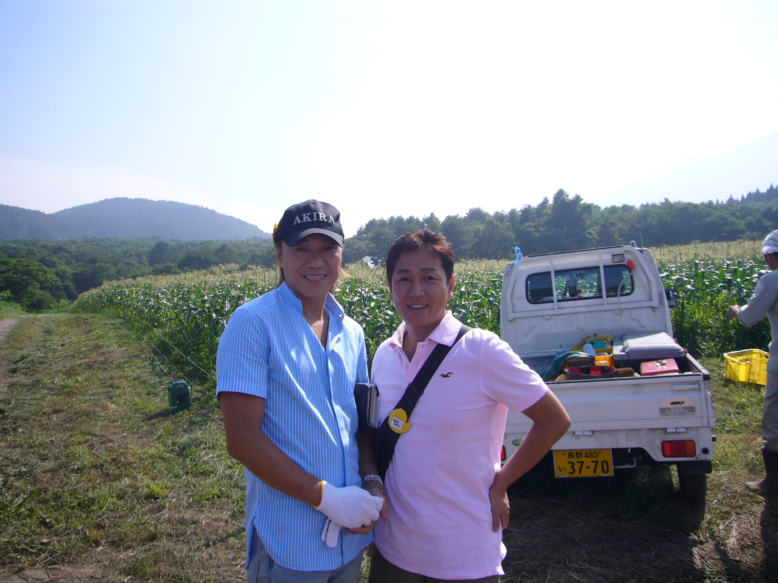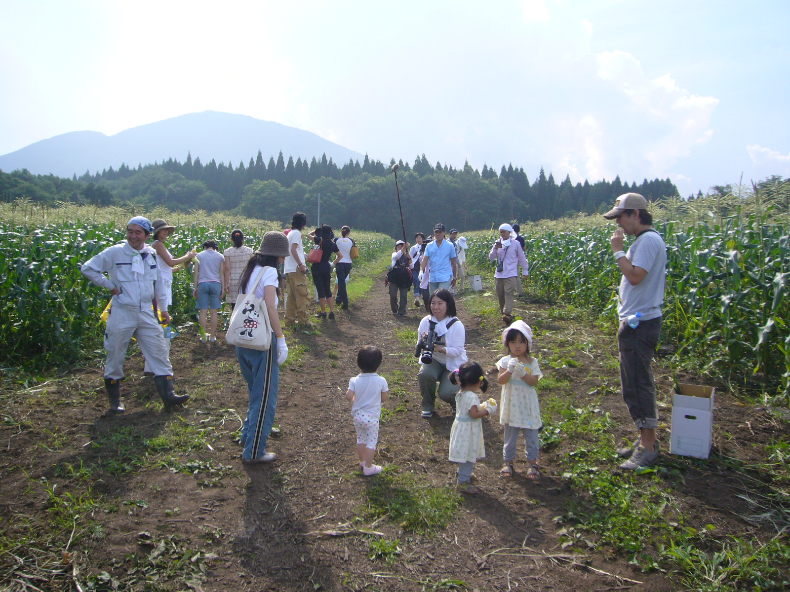 チェックインして午後1時半にロビーに集合。参加者の6割は小学生以下の子供たちです。バスに乗って信濃町のとうもろこし農場へ出発。