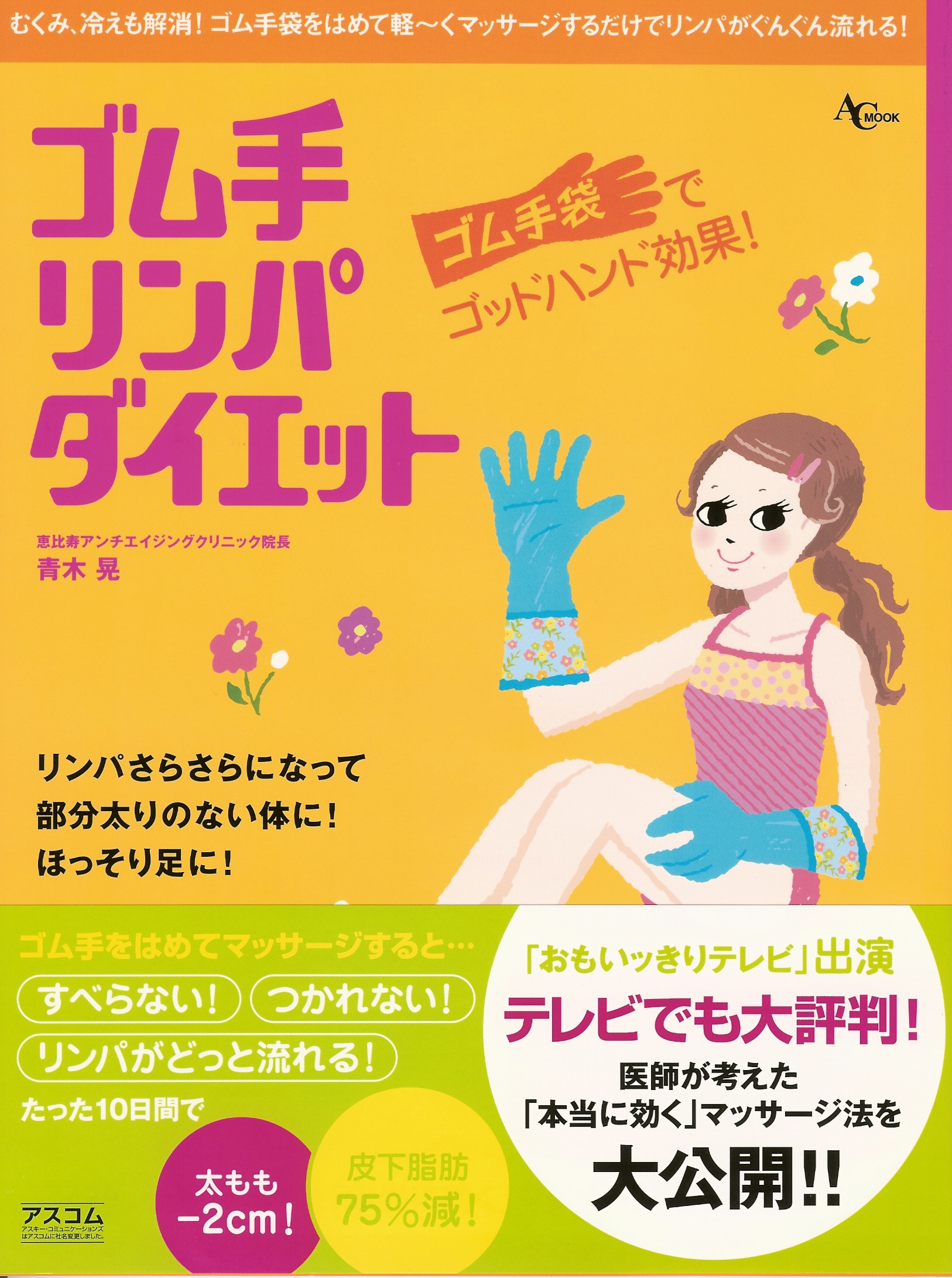ゴム手リンパダイエット新しい本が出ました!おもいッきりテレビで松原のぶえさんにも指導したゴム手袋を使ったリンパマッサージ。アスコムのMOOK本として来週火曜日から書店に並びます。エビデンス的にもクリニックでデータ取りをきちんと行った本格的内容のもの。でも見た目の感じはものすごくフレンドリーに仕上がっています。