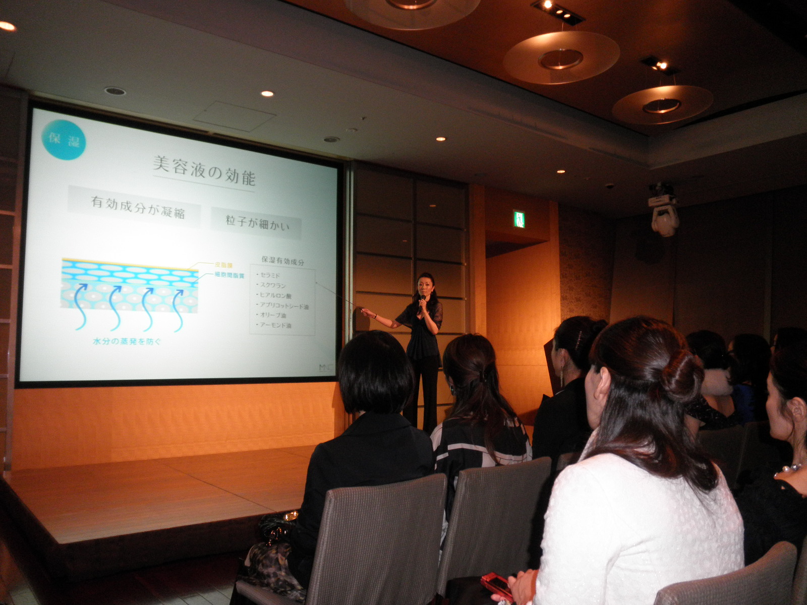 本の内容に沿った美肌の作り方のポイントをわかりやすくレクチャー。その後は、カクテルパーティーの懇親の場に。そこで、私も一言ご挨拶と未奈子さんと共同開発しているアンチエイジングサプリメントのご案内をさせていただきました。