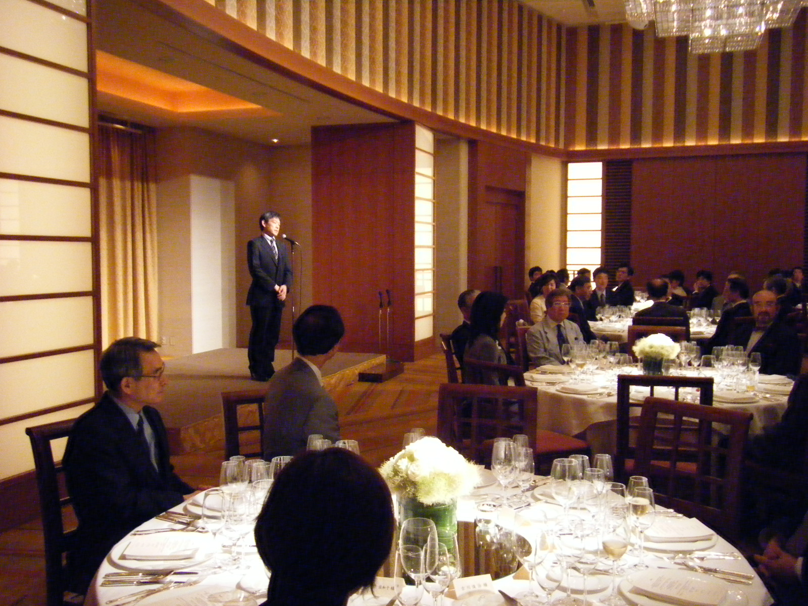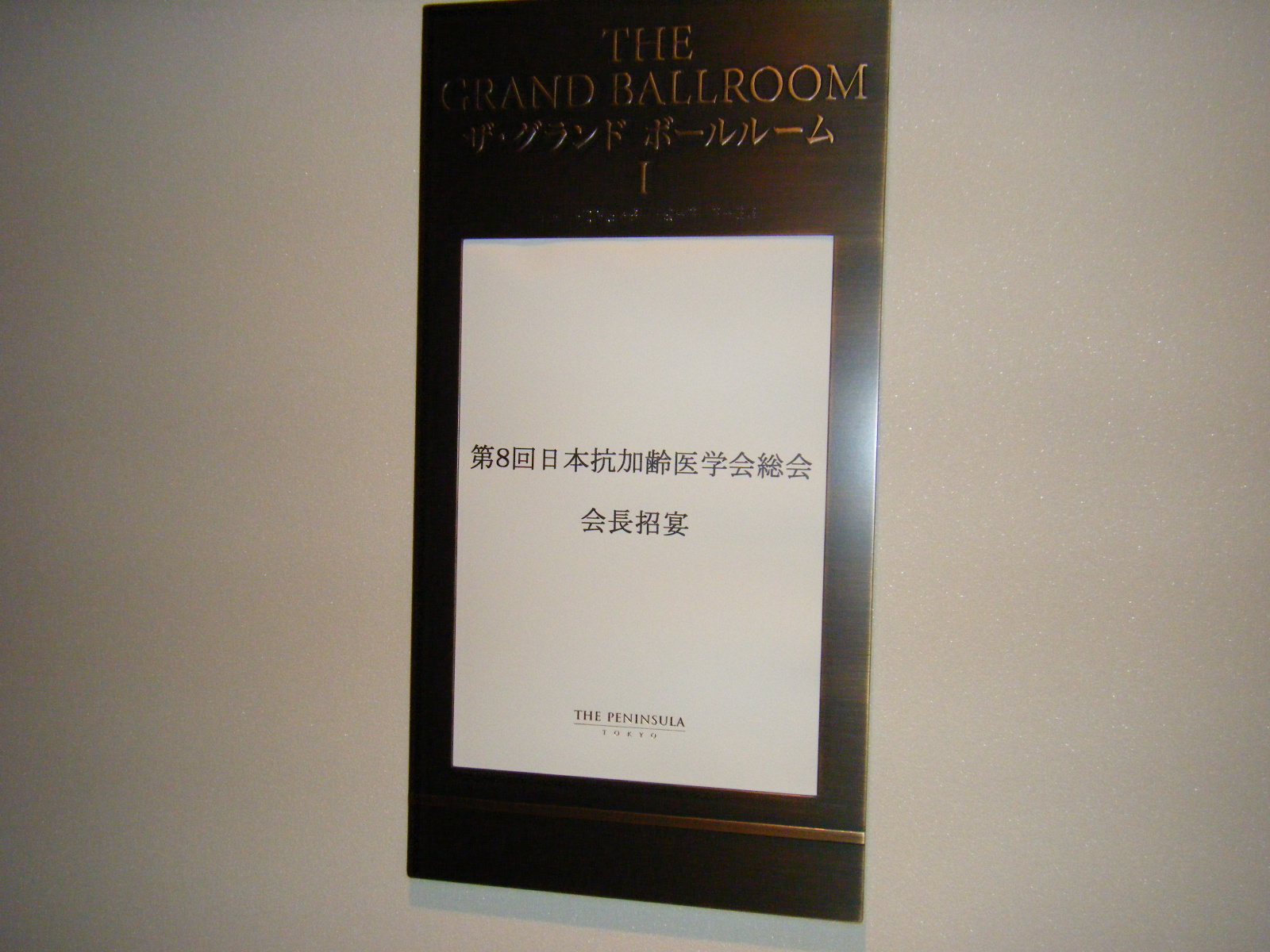 さて、役員会の後は場所を、ザ・ペニンシュラ東京に移して、会長招宴パーティがありました。今回の第8回総会の主管はわが順天堂大学大学院加齢制御医学講座ですので、私たちがホストとなります。主賓として日本医学会会長の高久文麿先生をお迎えし、130名ほどの方々に来ていただくことができました。