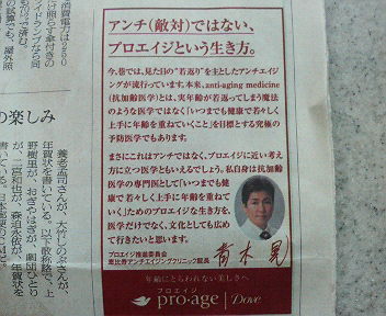 ここに来て、多くの日本の有識者や美容業界の大御所などが「脱・アンチエイジング」を一斉に唱えだしました。それが、「ハッピー・エイジング」であったり、「ビューティフル・エイジング」であったり、はたまた私も加担している「プロ・エイジ」であったりするわけです。「歳を重ねることは人生の熟成でもあり、いい歳のとり方をすることこそが私たちの目指すべきスタイルである」、これがその共通したフィロソフィーのようですが、う~ん、、、「アンチエイジング医学」もそれを目指しているのです…