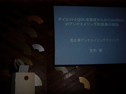 初めに東邦大学薬学部の後藤佐多良先生が「食餌制限の抗老化作用:老齢げっ歯類研究からの視点」というタイトルで、続いて長崎大学病理学教室の下川功先生が「カロリー制限と寿命:神経内分泌系の適応」を。3番手は白澤先生で、「インスリンシグナルと個体寿命」。ラストに臨床の現場からの視点で、私が「ダイエットとアンチエイジング:アンチエイジングクリニックにおけるダイエット外来の実際」について講演させていただきました。