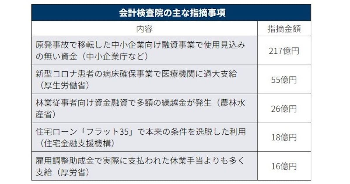 コロナ以外では東京電力福島第1原発事故で移転を余儀なくされた中小企業向け資金援助事業の約217億円が使用見込みのないまま放置されていたと指摘した。