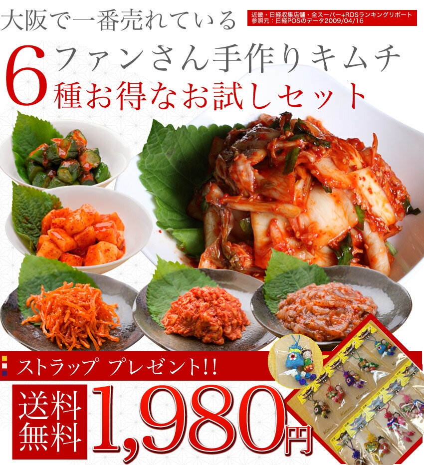 期間限定送料無料★お試しパック!キムチ6種類セット計860g(白菜キムチ200g ダイコンキムチ200g 胡瓜キムチ200g イカの塩辛キムチ100g チャンジャ80g スルメキムチ80g)ストラッププレゼント付き★あす楽_★(黄さんの手作りキムチ 高麗食品) 価格:1980 円 口コミ:310 件 / 平均4.58点 |
