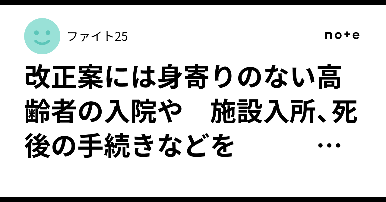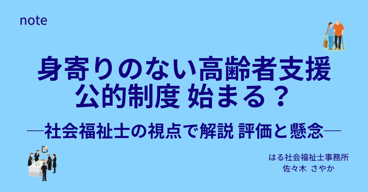 身寄りのない高齢者支援 公的制度始まる?─社会福祉士の視点で解説 評価と懸念─|佐々木 さやか_社会福祉士厚生労働省は、頼れる家族がいない高齢者を支援する新制度設立に向けて動き始めています。 入院や老人ホームへの入所、死後の事務まで支えるこの仕組み。 当事務所のお客様からも、これまでに切実なご相談を受けています。 「行政が家族の代わりに支えてくれたらいいのに…」そう思っておられるお客様にとっては、今回の新制度設立は朗報でしょう。 しかし高齢者福祉専門の社会福…note.com